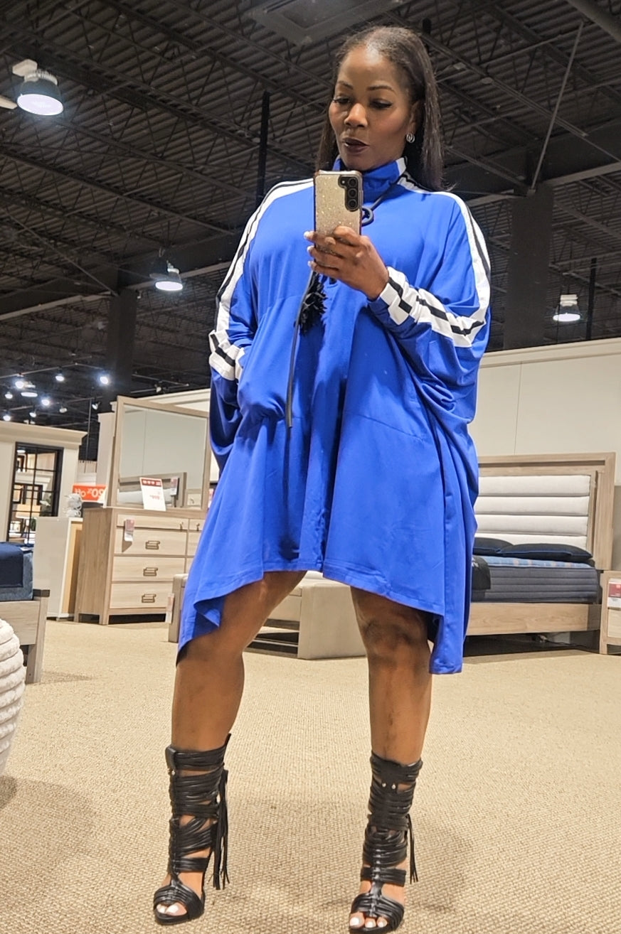 Over-sized Cape/Dress Pullover with High Collar and Striped Arms.