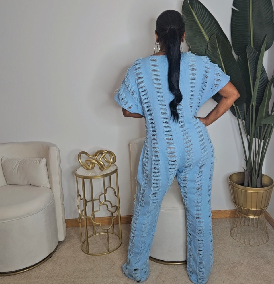 Short Sleeve Deep V-Cut Light Denim Jumpsuit